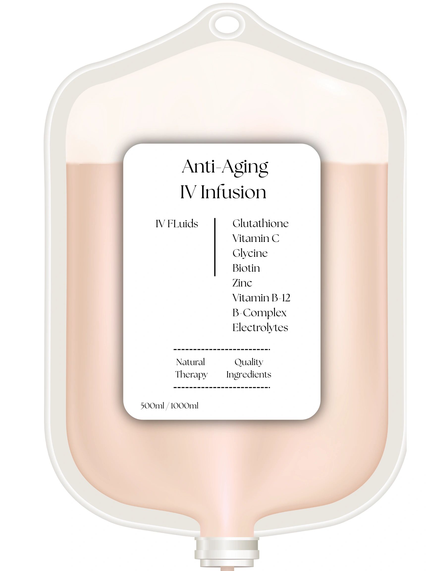 Our Anti-Aging IV Therapy is designed to revitalize your body from the inside out by enhancing energy levels, promoting healthy skin and hair, reducing oxidative stress and inflammation, and supporting cognitive function. This comprehensive formula helps counteract and repair aging-related damage at the cellular level.